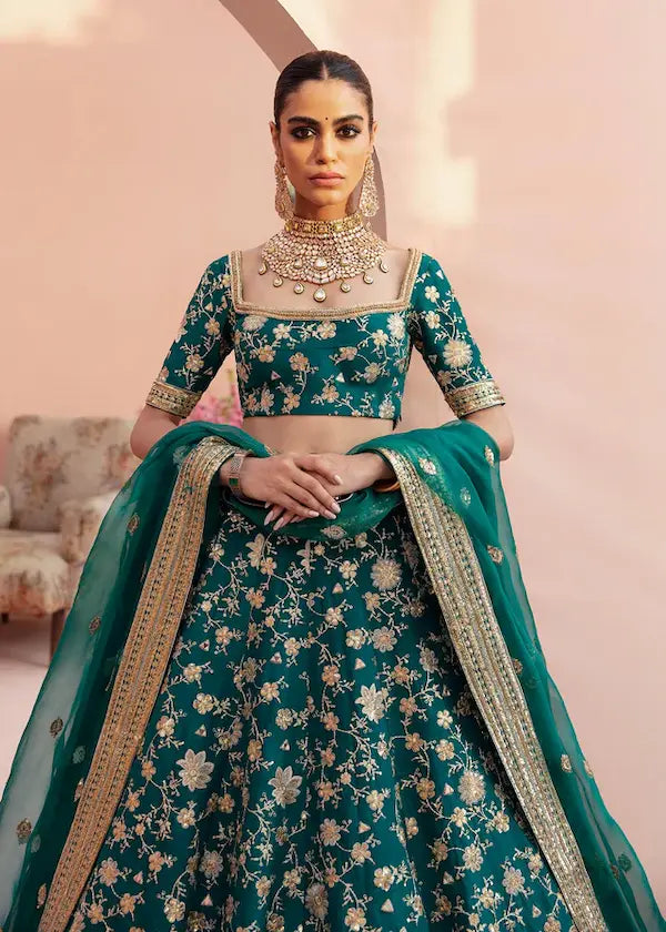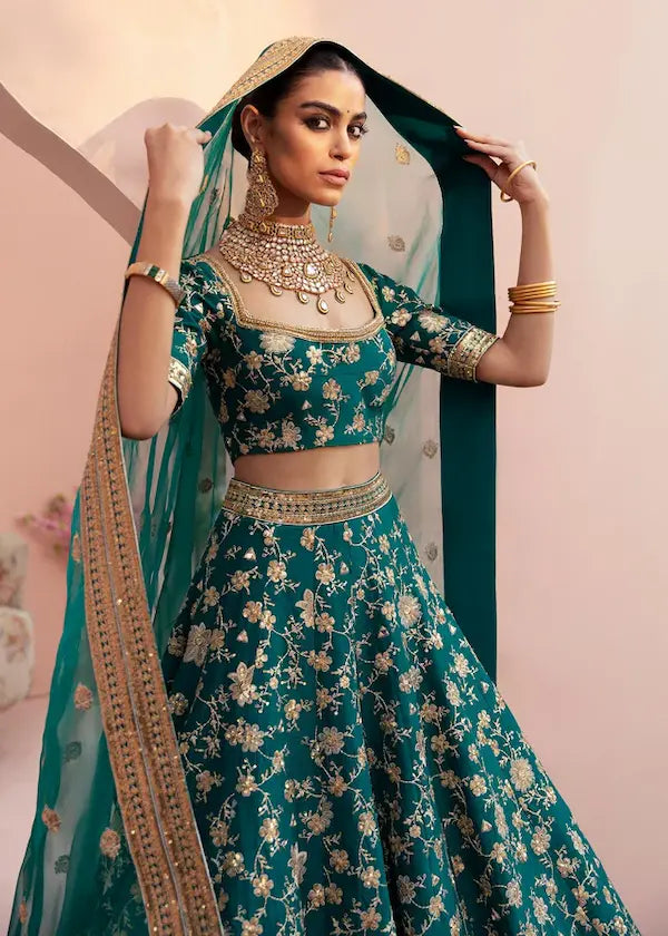 Shahrbaanu – Luxury Mehndi & Formal Dress & Bridal Lehenga: Carefully fastened by our artisanal experts, the pattern creates a vibrant bed of flowers consisting of thread and tilla motifs. Square shape wide neckline is intricately embellished with zardozi, crystals, and mirror work, making it a true haute couture embellished lehenga. A piece from our expanding conscious couture carrying the legacies of artisans and ancient craft, paired with the same color four-sided border dupatta. Perfect for trending Mehndi, Formal & Wedding events, this luxury bridal and formal outfit ensures elegance and sophistication for every wearer.