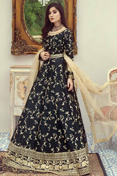 A beige glimmering black pishwas with all over jaal and an hand embroidered hand work neckline an boder elephant the hem. It features a dupatta with of golden organza and gorgeous trellises on both sides of the pallu rendere.