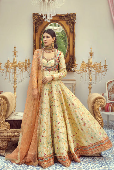 Mirah is an hand made tulle coral skin pishwas. with hand work multicolor jacket Floral trellises and dyed Croatian border are eminent on its voluminous lower. The bodice features a meticulously embellished golden motif. The look is completed with a sheer organza dupatta coral peach.