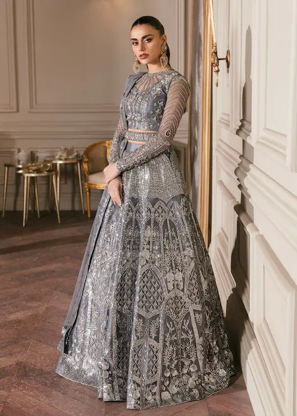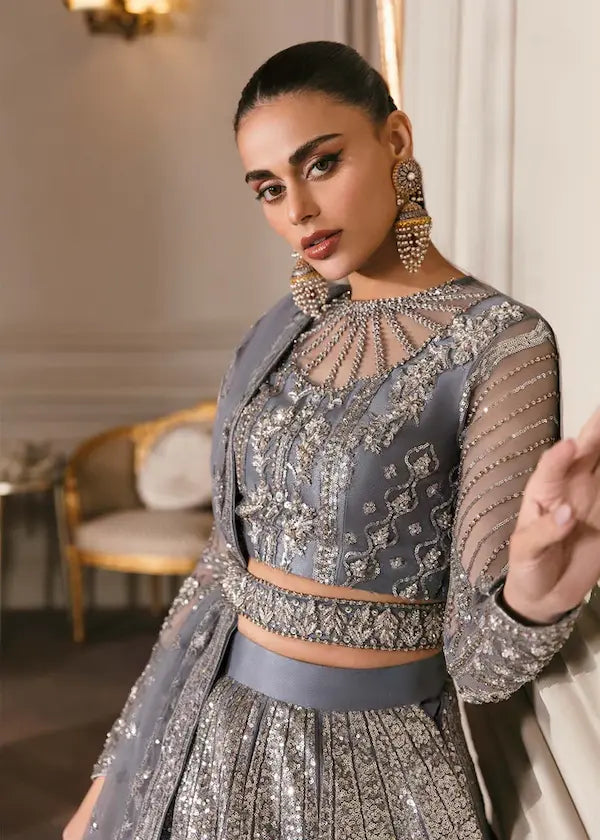The breathtaking grey formal "Florentina" consists of hand a richly embellished tulle bodice and volume panels with a rich border tulle dupatta featuring zardozi, crystals, sequin and resham work. Paired with waist Belt.