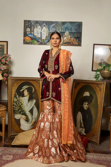 A fully embellished Naaz shirt with floral motives and a naqshi dabka stone Swarovski at the hem, enhanced with intricate hand work and adorned with pearls and crystals. It is paired with a sharara badla fabric.