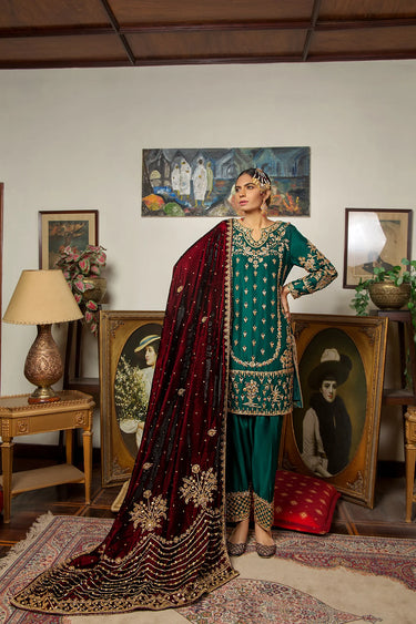 A fully embellished Zeba shawl with floral motives and a naqshi dabka stone Swarovski at the hem, enhanced with intricate hand work and adorned with pearls and crystals. It is beautiful look.
