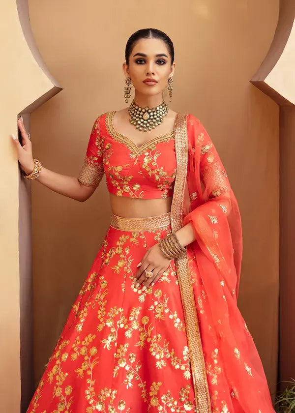 Aarohi – Luxury Lehenga & Mehndi Dress / Formal Lehenga in Orange: A perfect festive occasion outfit, this lehenga features a neckline adorned with crystals, sequins, pearls, and zardozi work. It is paired with a same floral tilla & sequins embroidered lehenga featuring a décolleté neckline, along with an embroidered chatta net dupatta with four-sided border. Perfect for trending Mehndi, Formal & Wedding events, this haute couture embellished lehenga ensures elegance and sophistication for every wearer.