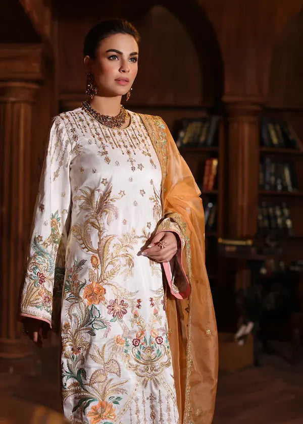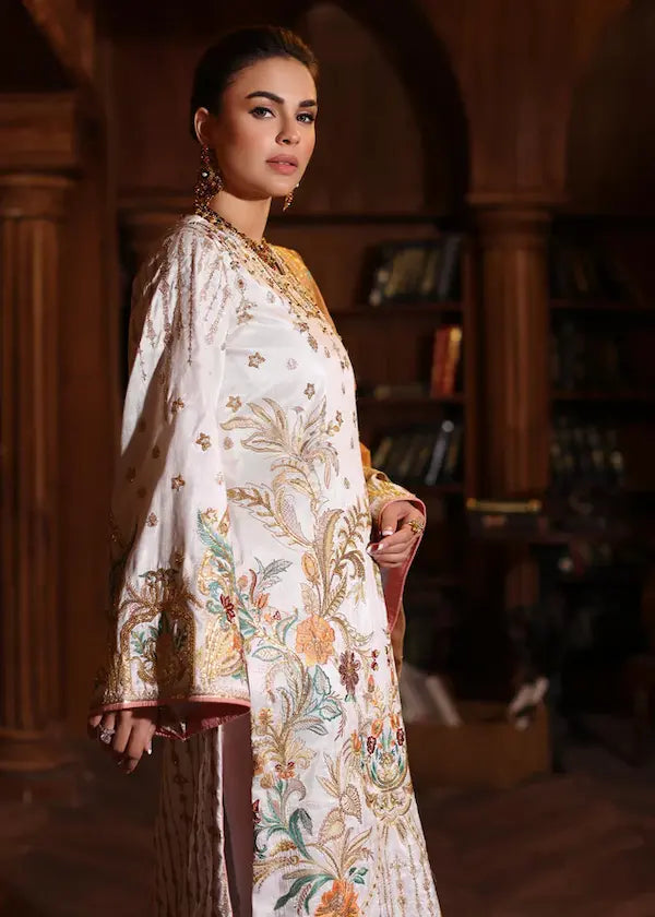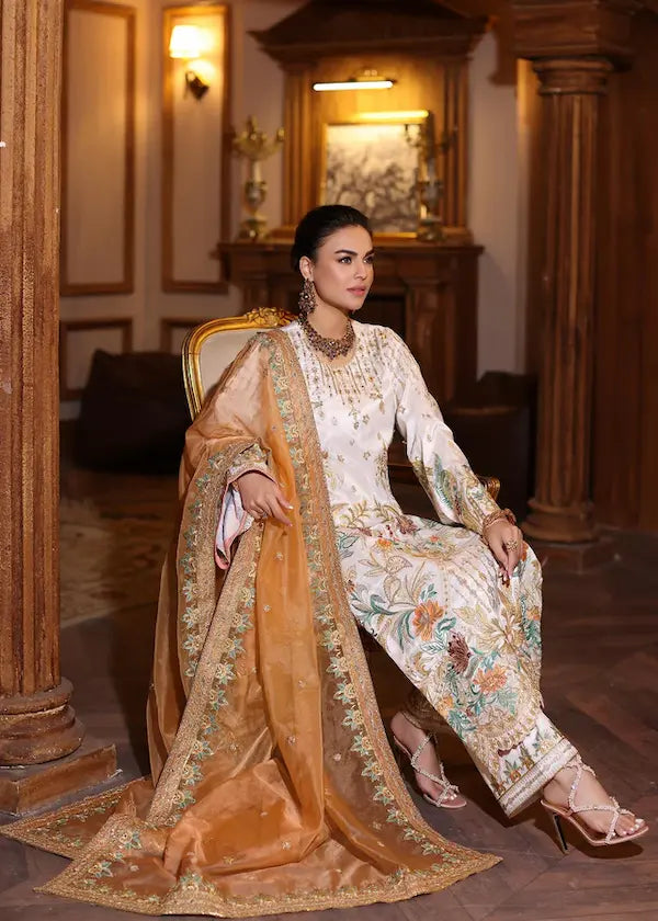 Elegant formal wear white Raw silk matching dress. Shirt is heavily Embellished with tilla, pearls, sequins and resham thread work in contrasting color hues which makes the outfit standout more. It is further paired with the peach organza dupatta with four sided sequin work border and centre booti chatta with matching Rawsilk loose pants .