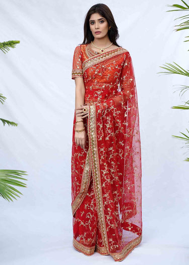 Deepika is an red wine saree with border organza saree complimented with embellished flowers, sitari and tilla in multicolor hues paired with a delectable brocade with jamawar choli complete with a scalloped border hand work in a beautiful jaal pattern.