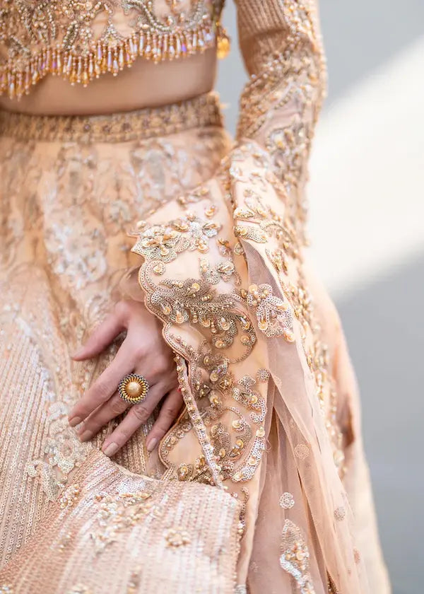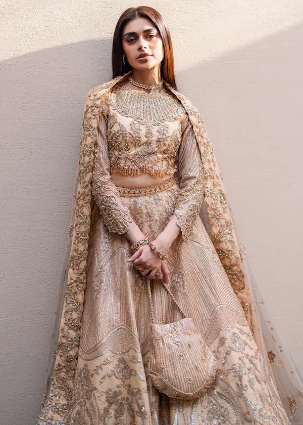 A fairytale written in gold, embellished with the dreams of tomorrow, this ethereal lehenga set has handcrafted choli with pearls, Crystals, Bugle beads, dabka and sequins. Dupatta has four side scalloped edges with embroidery and hand embellishments. Lehanga in this ensemble showcases exquisite shining sequence work along with the hand embellishment on its waist belt.