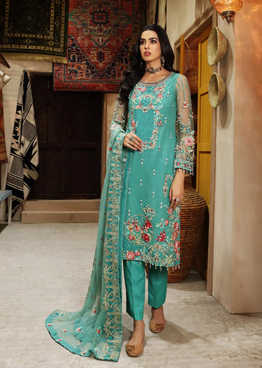 Like a mirage, crafted in an enchanting shade of azure, this breathtaking 3 piece is the epitome of regality. The stunning Resham and hand embellishment on the front daman and sleeves enhances the sublime beauty of this outfit. It is paired with pent , the gloriously embellished net dupatta with tilla rasham and sequins work gives it an aura of royalty.