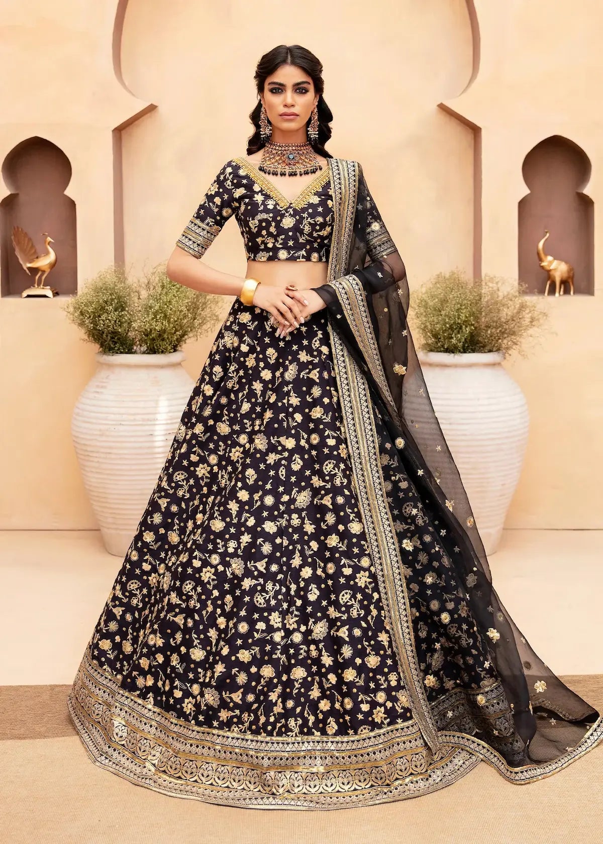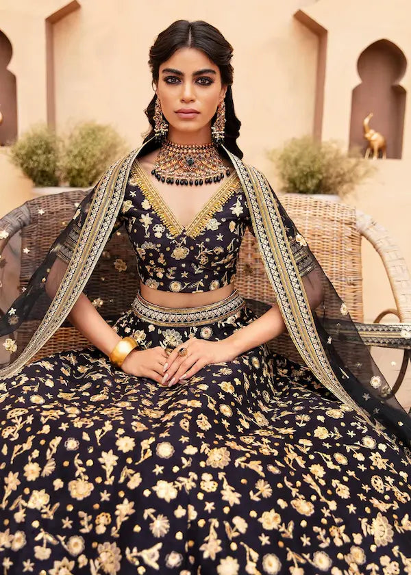 Lakshmi – Luxury Lehenga & Mehndi Dress / Formal Lehenga in Black: This head-turning lehenga comes with a focus on flora and fauna thread & tilla motifs against a dark night sky. The V-shaped neckline is intricately illustrated with crystals, pearls, and zardozi. It is paired with a black color dupatta with a four-sided embellished border. Perfect for trending Mehndi, Formal & Wedding events, this haute couture embellished lehenga ensures elegance and sophistication for every wearer.