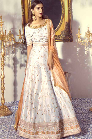 A 3 piece white lehenga choli, mamoona is a contemporary take on the timeless lehenga and choli. The lehenga is decorated with signature lotus and ALL Over jaal or motifs further decorated with stunning stones and beads with an embellished choli. hand made neckline It is paired with a Net dupatta with chand Bali spray embellished borders and a breathtaking. tilla to compliment the grace and charm.