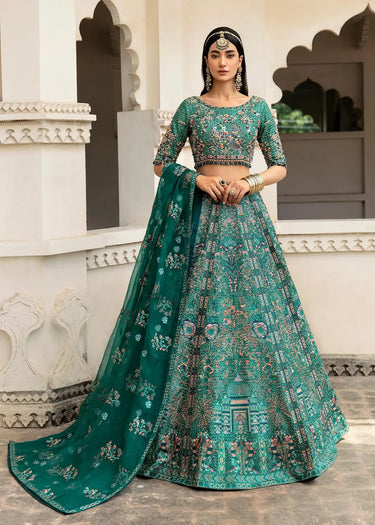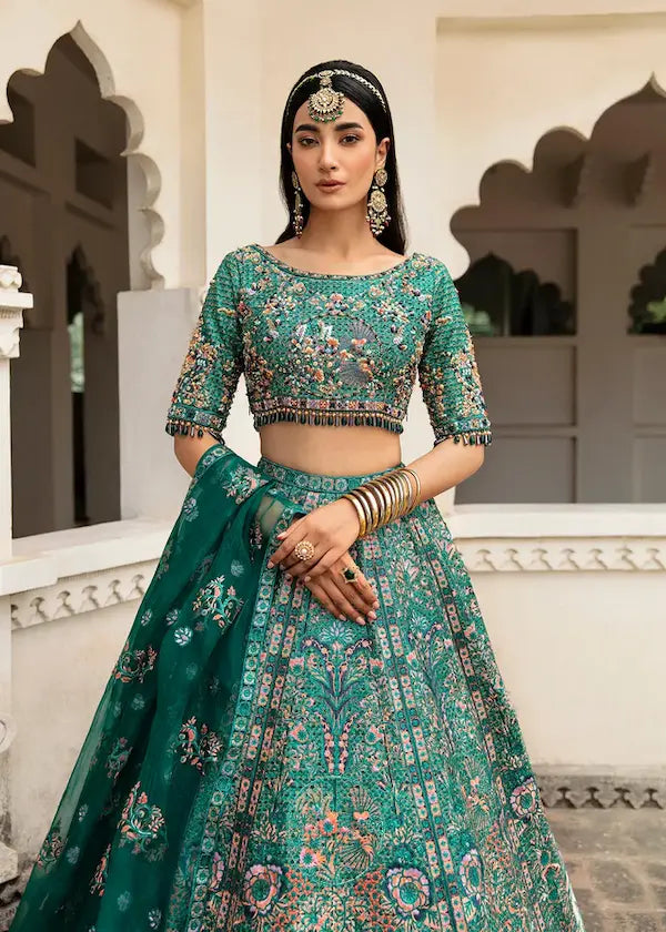 "Mehar Bano" is a heirloom ensemble that celebrates the grandeur for mughal era. This beautiful dress so perfectly defines elegance and grace. The marvellous green sequinned detail all over the dress with colourful thread work make this a perfectly refined lehanga. Choli has sequin embellished fabric done with heavily hand work on it using cut-dana, sequins, crystal stones, nakshi and dabka. It is paired with graceful green organza dupatta with 4 sided border along with centre booti chatta. It represents the vitality of the season and gives off a joyous and wonderful vibe of its own.