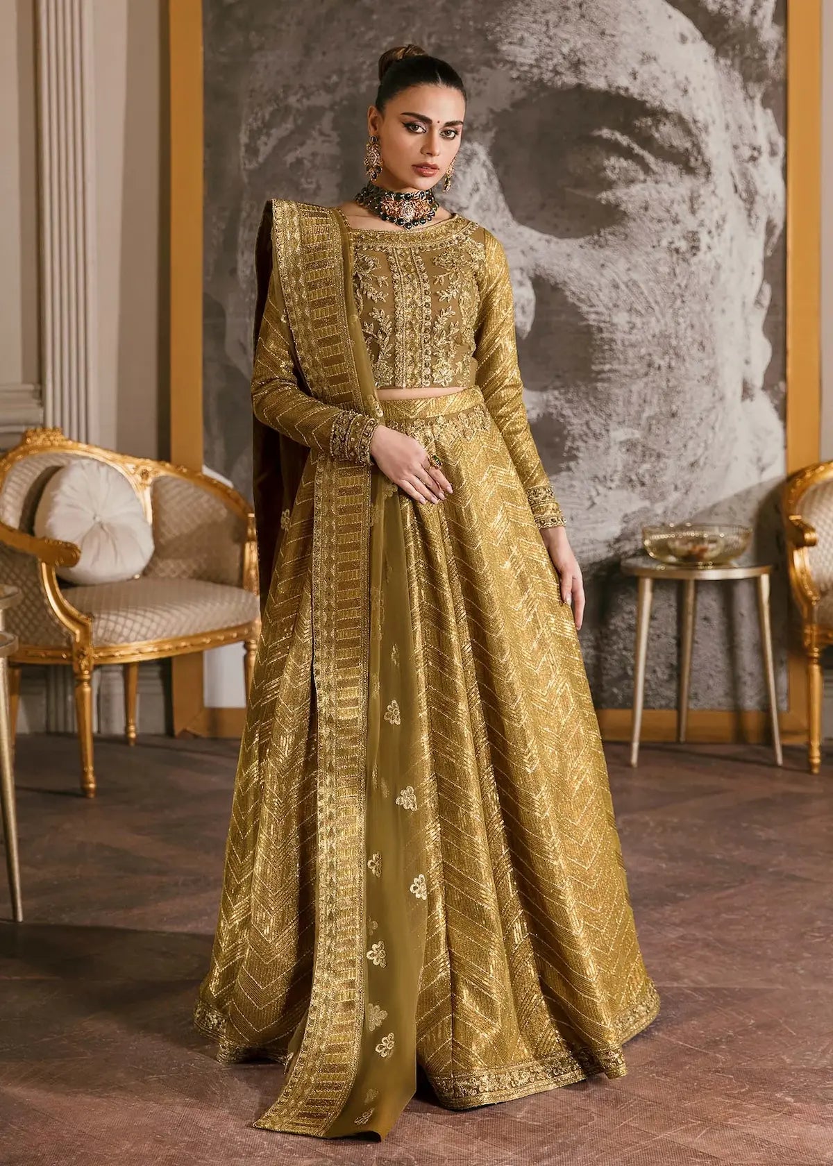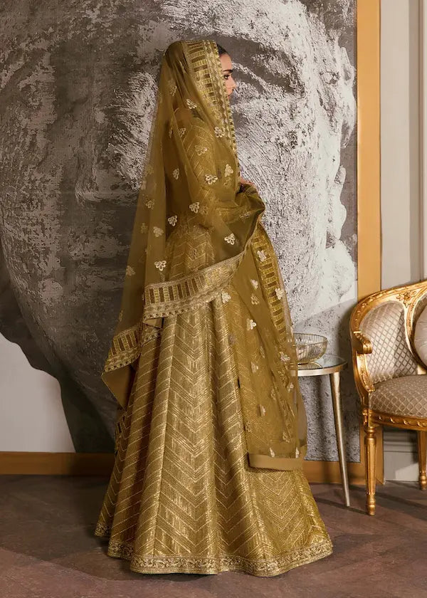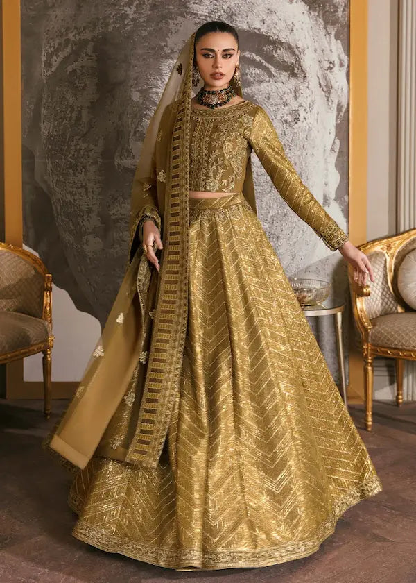 "Orchid" is stunning ensemble of this collection. It is in classic shade of olive green which glimmers and dazzles. Lehanga has horizontal zigzag panels of sequence along with the border on the bottom. Choli has hand embellishment of zardozi, crystals and sequins on body with the addition of zigzag sequence on the sleeves. Dupatta has two side wide border along with the chatta in it. This outfit has all the elements that we have emulated with this ensemble.