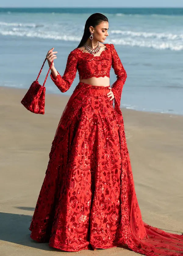 .An ensemble for bridal wear or formal wear, a majestic lehenga set in rich hue of red. Featuring scalloped-edged neckline, sleeves opening and choli waist. It has crystal tassels on the waist. Lehanga is Shimmering with sequins and its waist is also handcrafted for pure elegance. Dupatta is fully indulged with emballishements.