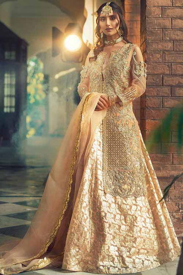 It is a 4 piece stitched outfit including shirt, slip lehenga and dupatta. It is in powder peach shade but can be customized in any color. It's a shirt with front open or side slit, paired with a lehenga as a lower. Fabric for shirt is Net, fully hand embellished from front, back and sleeves. Badla fabric is used for lower with laces applied on bottom of it. Dupatta is a in organza fabric with embellished border patched on all four sides.