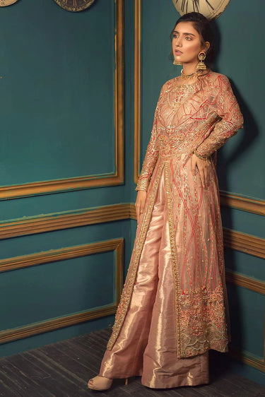 Two piece stitched outfit including gown and trouser. Fabric for shirt and is Net trouser is Tiusse with tissue lining attatched body. is all hand work Resham Swarovski stone naqshi sequence. it with hand embellishment. This outfit is embellished from front, back and sleeves.