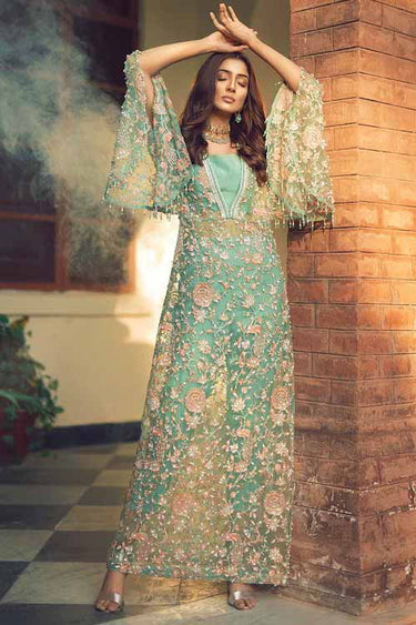 A flattering silhouettes is adorned with intricate motifs and delicately embellished borders with crystals, sequin and resham on a sublime shade of coral green. Hand made work for all are stitched on sleeves and bottom edges of the shirt to create a luxurious graceful look.