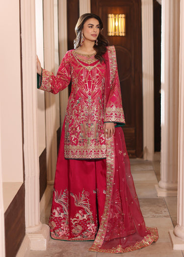 Finding its roots of mughal Heritage! Experiences timeless festive beauty with pink shirt paired embroidered same color sharara pants which will hypnotize you with its charm. This ensemble features thread work, sequins and embroidery that infuse a majestic yet festive vibe adorned with intricate paisley and baroque motifs. the neckline is mala style hand embellished with nakshi, dabka, sequins, pearls and stone work. The sharara pant is fully embroidered with beautiful organza dupatta of four sided borders and centre booti spry