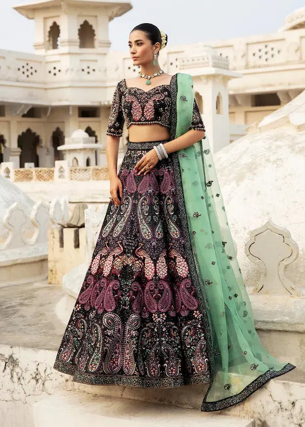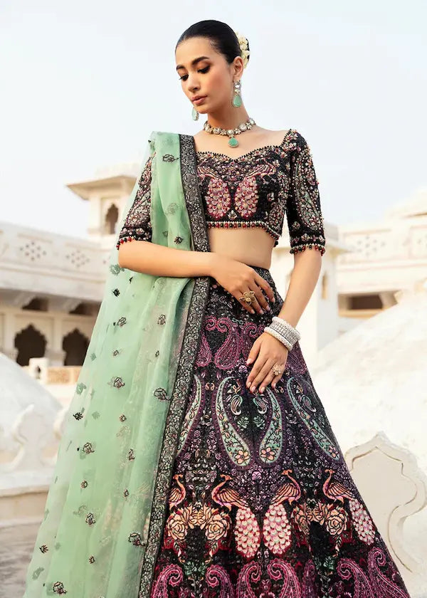 Nothing Compaves to the beauty of a Black Dress. “Zarqa Bano” Comprises a sequin embellished Blouse. It has heavily hand embellished neckline along with front, back & tassel, sleeves and waist. Blouse has hand embellishment of zardozi work, crystals, pearls & sequins. It further highlighted with peacock motifs. Lehanga has a sequin embellished fabric and is adored with 3D work Multi sequins motifs paired with Lehanga. The outfit has Green Organza dupatta with Black embroidered borders and centre heavy rasham embroided motifs spray which enhance the beauty of the Luxury Formal